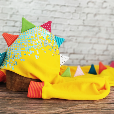 Genäht ist dieser obercoole Pullover aus wunderbar leichtem, kuscheligem Sweat. Sweat in höchster Qualität, weich im Griff und Innen schön warm angeraut. Die kleinen Drachenschuppen auf der Kapuze sind aufgepresst und natürlich waschbeständig. Je nach Lichteinfall schimmern diese wie auf den Fotos zu sehen in den schönsten Regenbogenfarben. Dein Räuberkind sticht damit garantiert aus der Menge hervor.