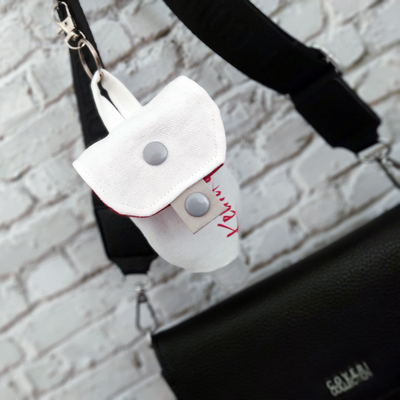 Das Fläschchen wird einfach mit dem Kopf nach unten durch das Loch im Boden der Tasche gesteckt. Alle Taschen werden je mit einem Karabiner geliefert (Optional in Silber- oder Gold-Optik).