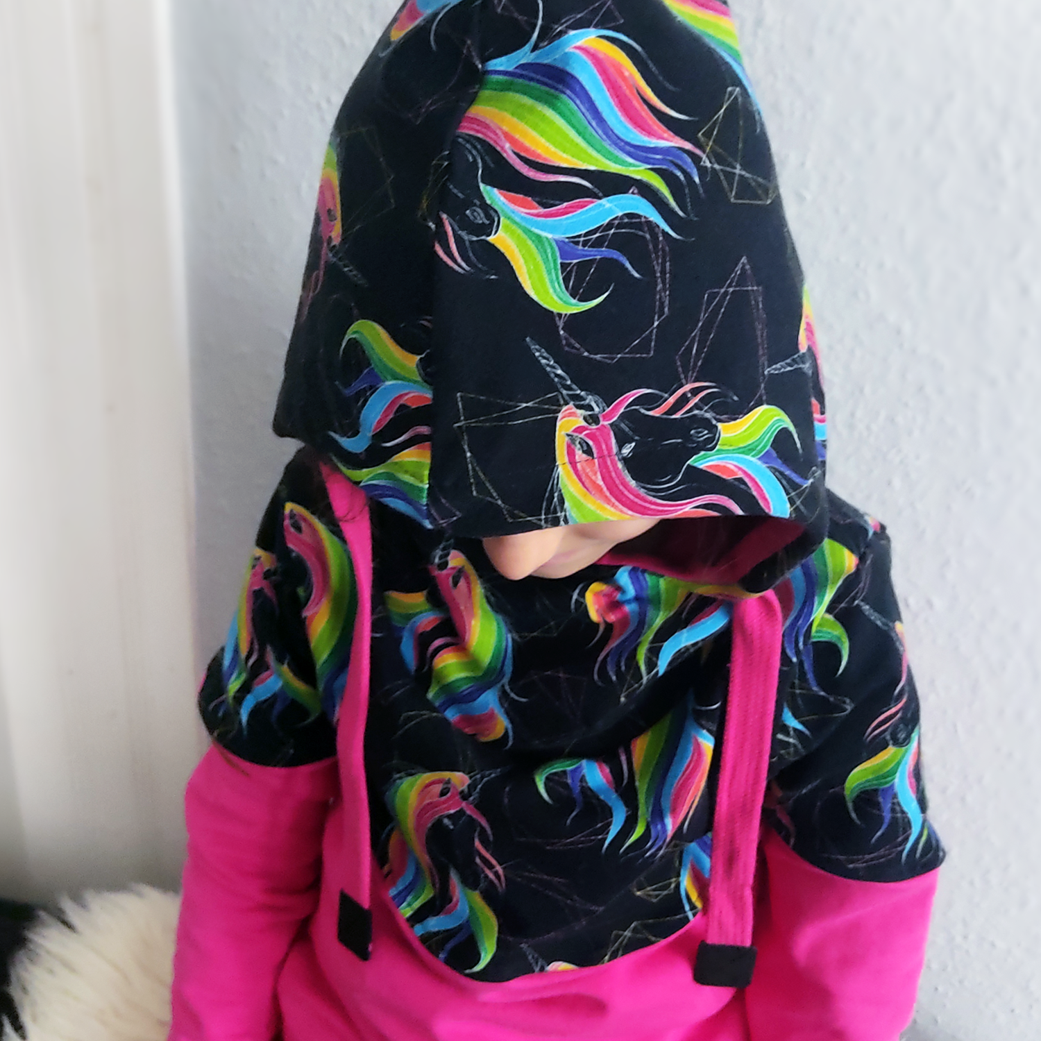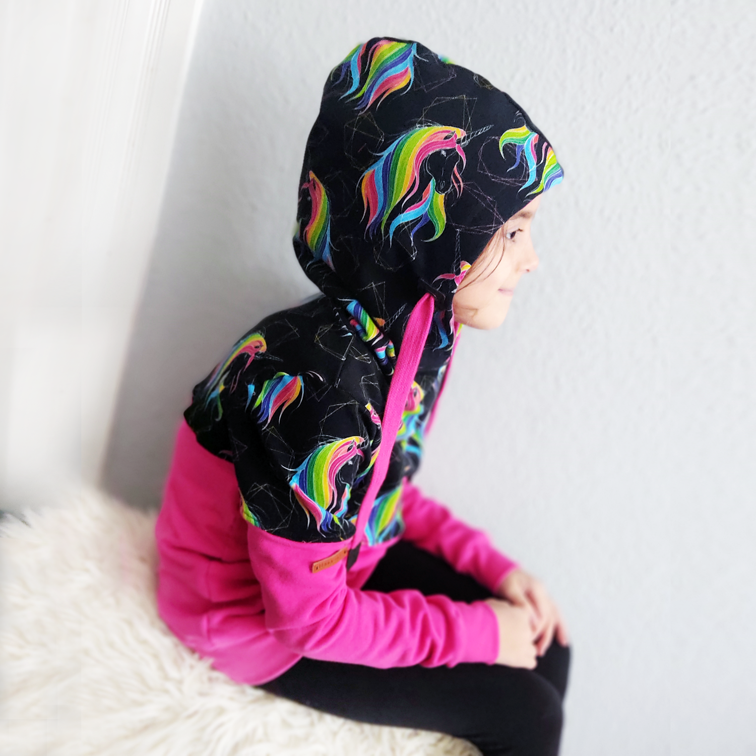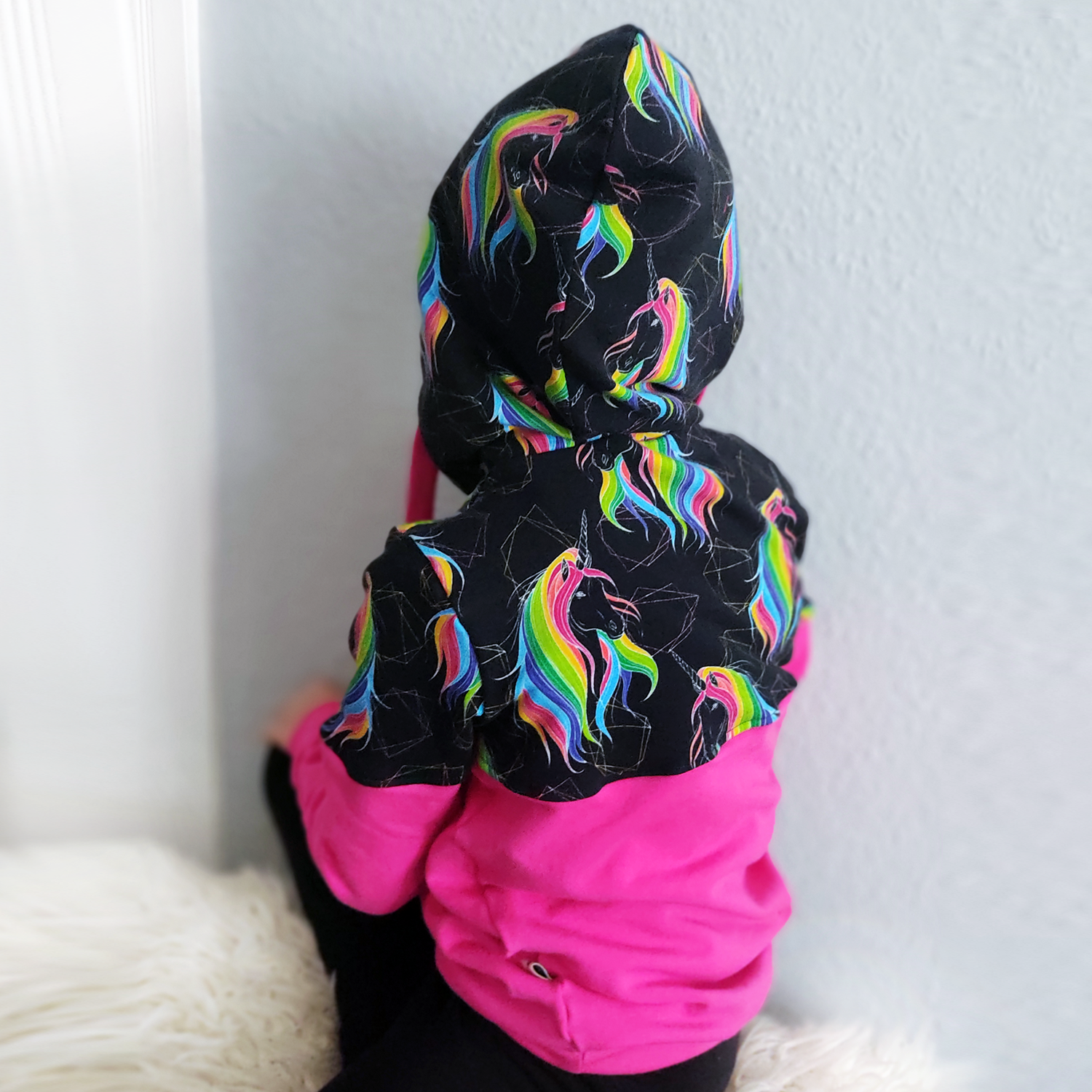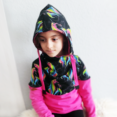 Die strahlend leuchtende Mähne der Einhörner machen diesen Hoodie zu einem wahren Blickfang.