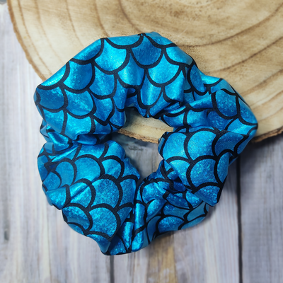 Dieser Scrunchie ist aus einem wundervollem Folienjersey genäht, bedruckt mit Schuppen in kraftigem Türkis und etwas Glitzer. Der Stoff schimmert im Licht wunderschön. Er ist weichfließend & leicht und dadurch besonders schonend für dein Haar. Das Scrunchie gibt es bei uns in 3 verschiedenen Größen: Small, Standard und Big – wähle selbst.